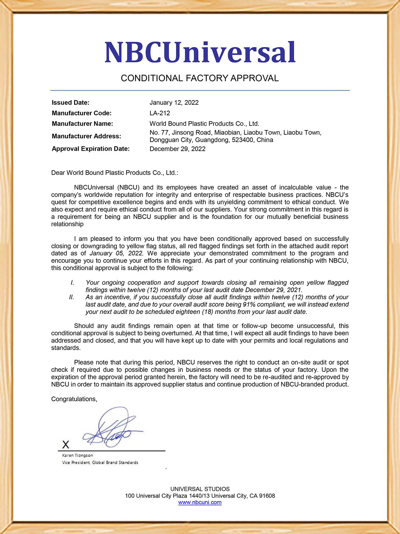 東莞市世邦塑膠制品有限公司玩具事業部隸屬于世邦集團,廠房面積27000平方米,我們有BSCI和SEDEX驗廠報告,NBCU環球認證,并通過WALMART, TARGET, HOMEDEPOT, DISNEY等大型美國商超認證,已取得IETP、3C、GSV、ISO9001、SCAN、ICTI、SMETA等多種合格證書。主要產品有模具、玩具、電器配件、醫療器械配件、家電類配件、電子產品、小家電、寵物用品,為高端品牌提供從產品設計、精密模具制造、注塑成型與組裝、售后服務為一體整套解決方案。有迪士尼授權認證,目前為多個國家和海內外知名企業提供禮品定制服務、代工生產服務、并成為長期的合作伙伴,(如:日本萬代、迪士尼、epoch等品牌合作) 世邦集團成立于2002年,以智能制造,精密制造為核心,運用合作共建,共享,共贏的模式,整合制造上下游供應鏈,優化全產業鏈,成為設計與創新,服務與生產為一體的智能智造企業集團。 世邦集團旗下設有8家制造工廠,遍布于東莞、廣州、深圳和越南;2家研發中心,分布于上海和香港。擁有精密模具制造車間、無塵注塑生產車間、無塵表面處理車間。擁有CNC、鏡面火花車間、各類大中型注塑生產線及壓鑄、精密吹塑生產線、環保真空飛鋁鍍膜生產線、全自動噴油生產線、邦定、SMT貼片、智能COB固晶生產線等數百臺先進制造設備。